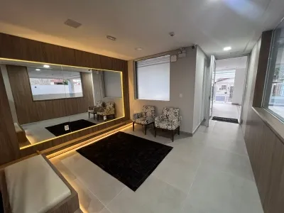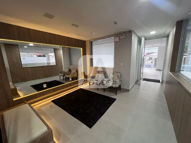 Residencial conta com salão de festas, elevador e hall de entrada decorado.